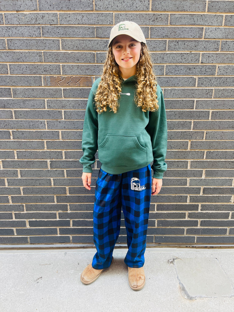 - Camper wearing BLUE flannel pants has a Youth Medium Hoody on